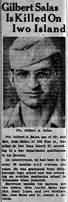 On March 20, 1945, the 147th Regiment arrived on the Island of Iwo Jima, joined by the 3rd Marine Division as a reserve force. It landed at Purple Beach, on the southwest coast of the island, and begins patrols to dislodge Japanese soldiers hiding in caves and shelters. On one of these patrols, on March 27, PFC Salas was left covering the retreat of his squad and was shot in the head and abdomen, dying shortly after. For this action he is posthumously awarded the Bronze Star.